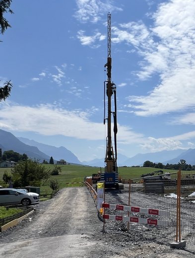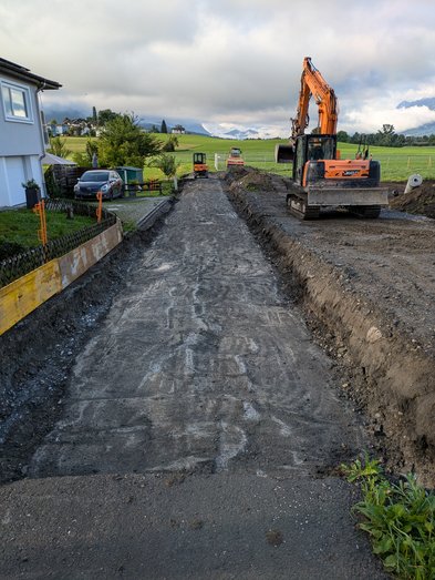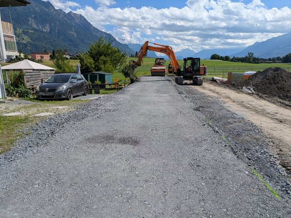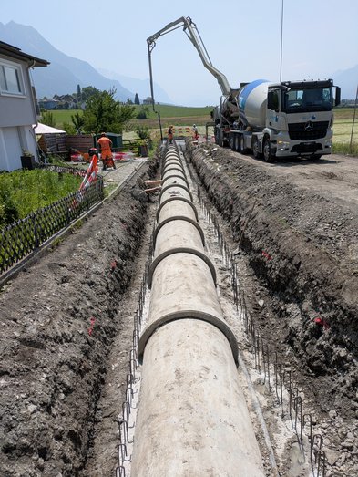 Bereits umgesetzt wurden Massnahmen zur Verstärkung der Kanalisation: Sie wurde vollständig mit Beton umhüllt. Zudem wurde eine Baupiste angelegt, die als Zufahrt zur Baustelle des Gewerbegebäudes dient und später auch für den Abtransport des grossen und schweren Bohrgeräts genutzt werden soll. Es ist vorgesehen, Teile der Baupistenkofferung bei der geplanten Strassenerweiterung weiterzuverwenden.