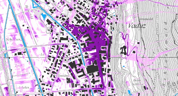 Die Karte wurde im Massstab 1:10‘000 erarbeitet und ist öffentlich einsehbar auf dem Geodatenportal von Liechtenstein oder schweizweit auf der Gefärdungskarte Oberflächenabfluss Schweiz.